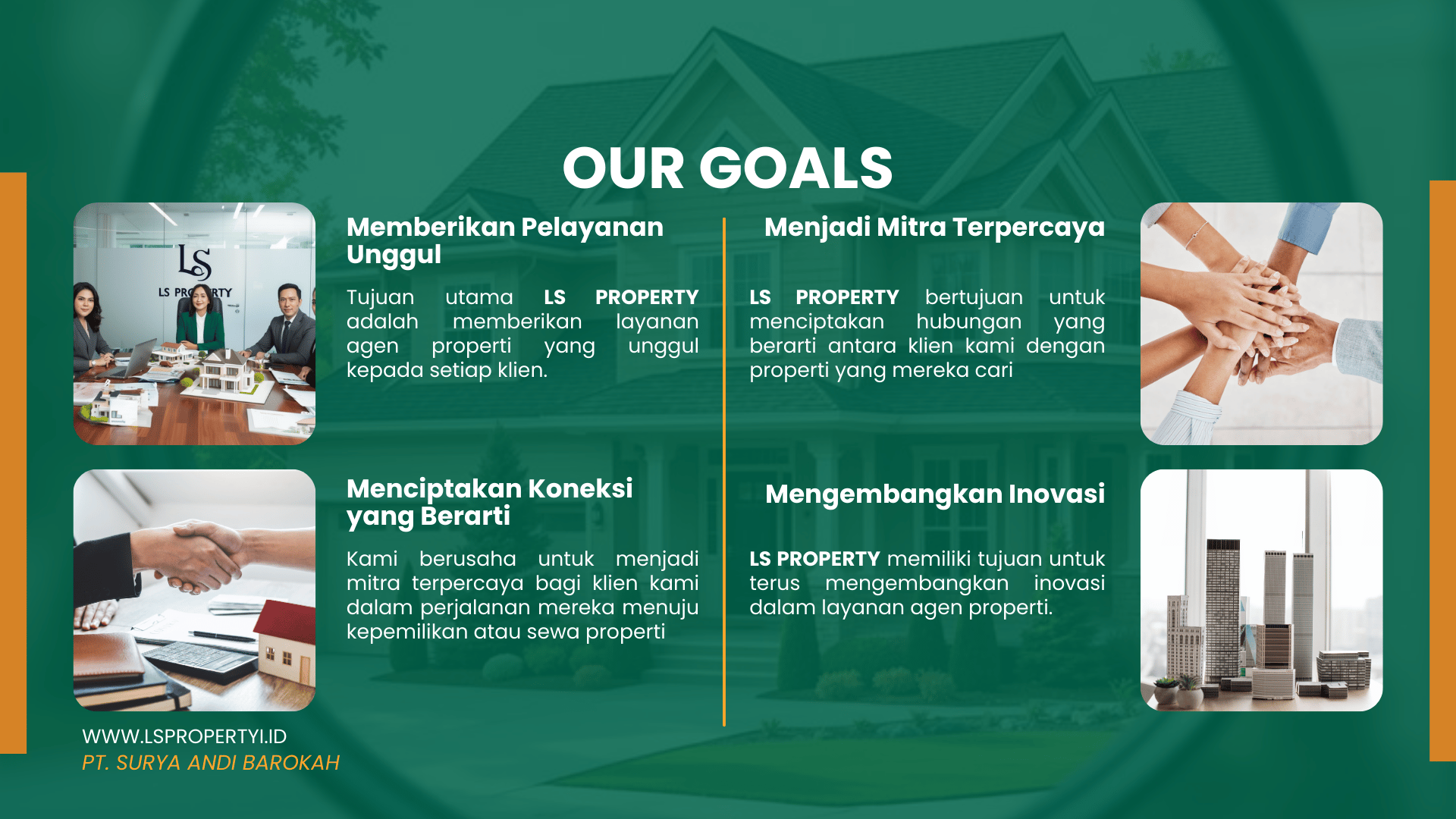 Memberikan layanan properti yang profesional, cepat, dan terpercaya. Menyediakan informasi properti lengkap dan akurat bagi pelanggan. Membangun kemitraan strategis dengan pengembang, investor, dan pemilik properti.