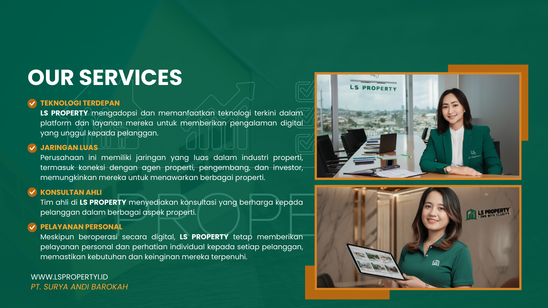 PT Surya Barokah Indonesia adalah perusahaan yang bergerak di bidang jual beli, sewa, dan kerja sama properti, serta konstruksi pembangunan dan interior dengan brand utama LS PROPERTY. Kami hadir sebagai solusi properti terpadu yang profesional, terpercaya, dan berorientasi pada kepuasan klien.