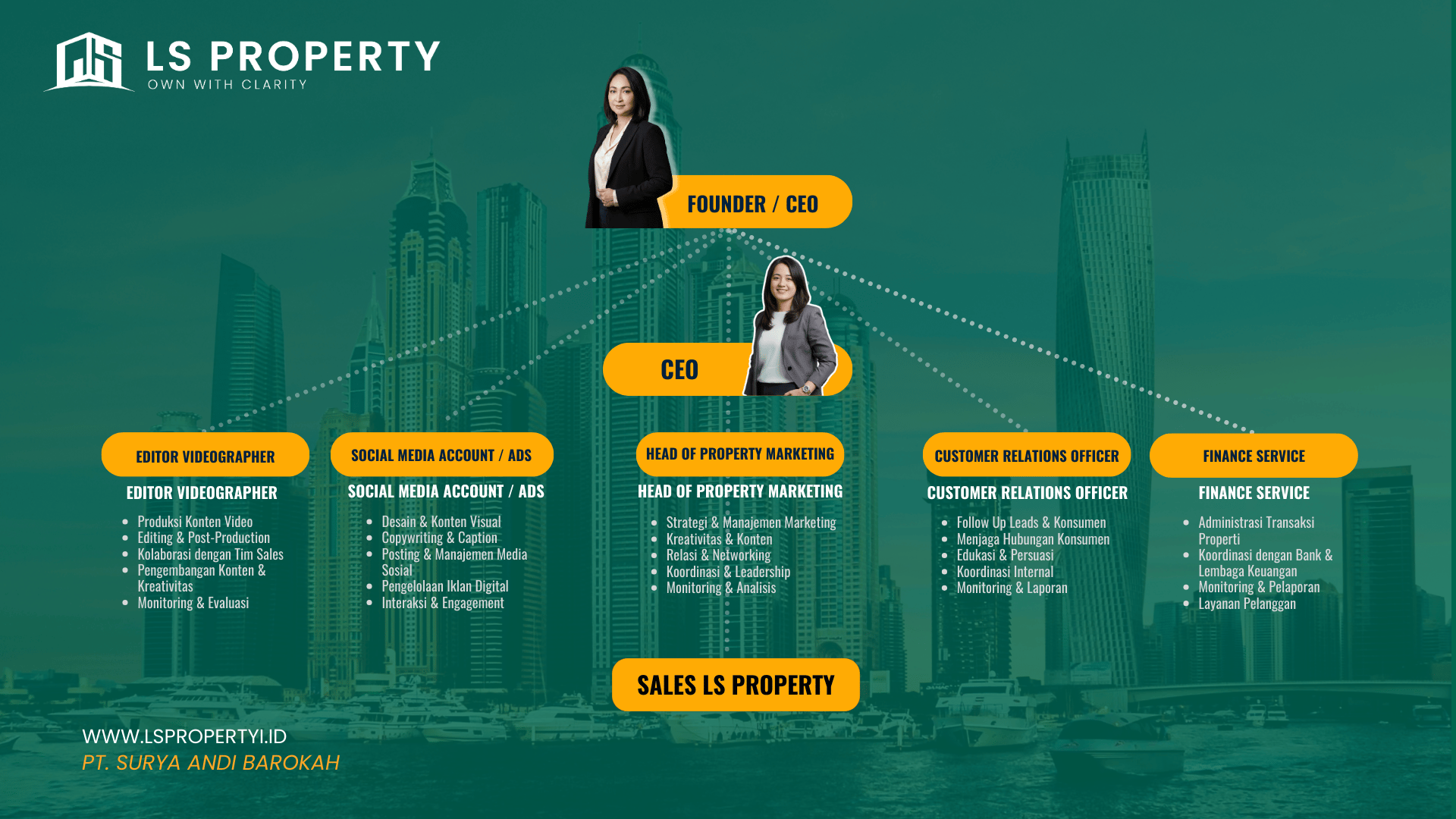 LS PROPERTY lahir dari perjalanan panjang Lisa Pasamalangi, yang awalnya dikenal sebagai seller dan konten kreator Indonesia–Brunei bertemu dengan Lily Setyawati K. dibackground Dosen University dan Pengusaha di bidang aksesoris perempuan hingga tas fashion. Berbekal pengalaman pemasaran, personal branding, dan networking lintas negara, Lisa dan Lily kemudian mendirikan LS MANAGEMENT.